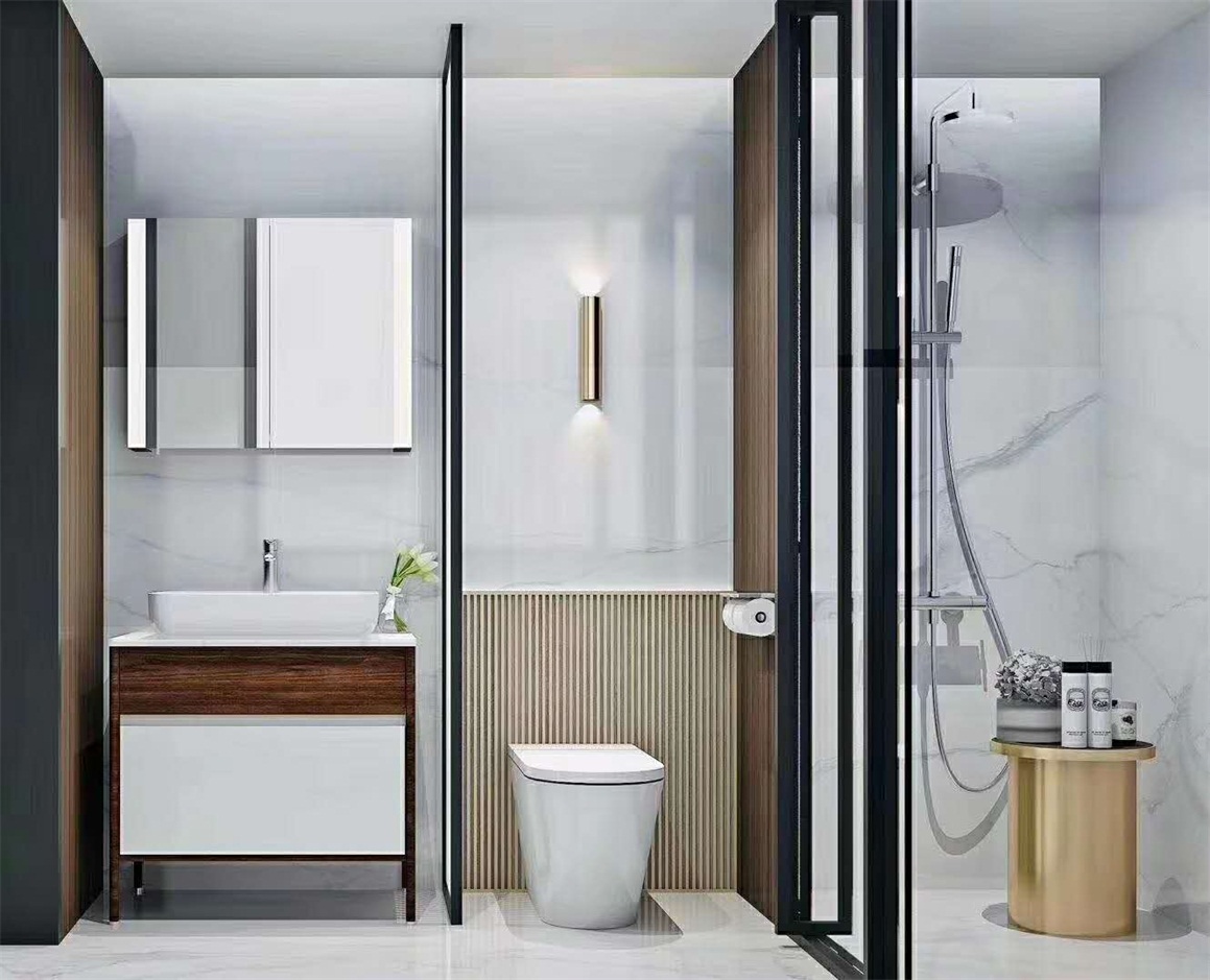 大理石瓷磚、木地板、不銹鋼線條、定制實木護墻板、乳膠漆。