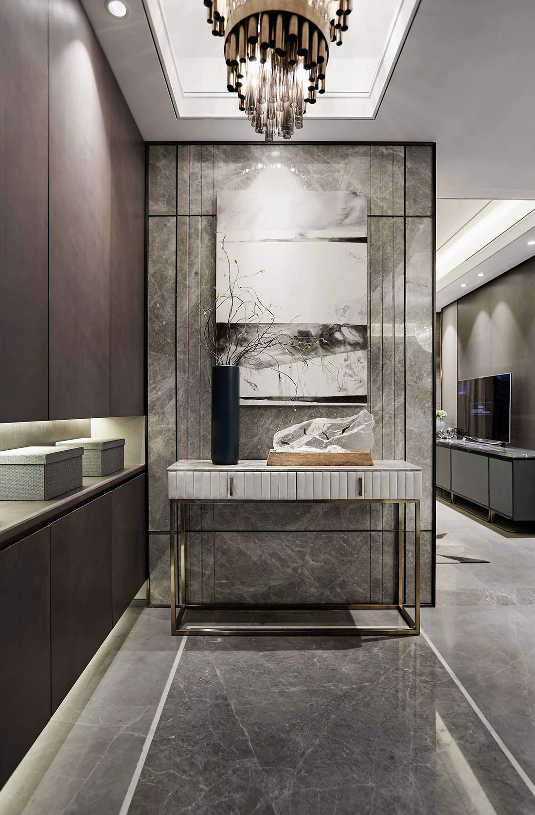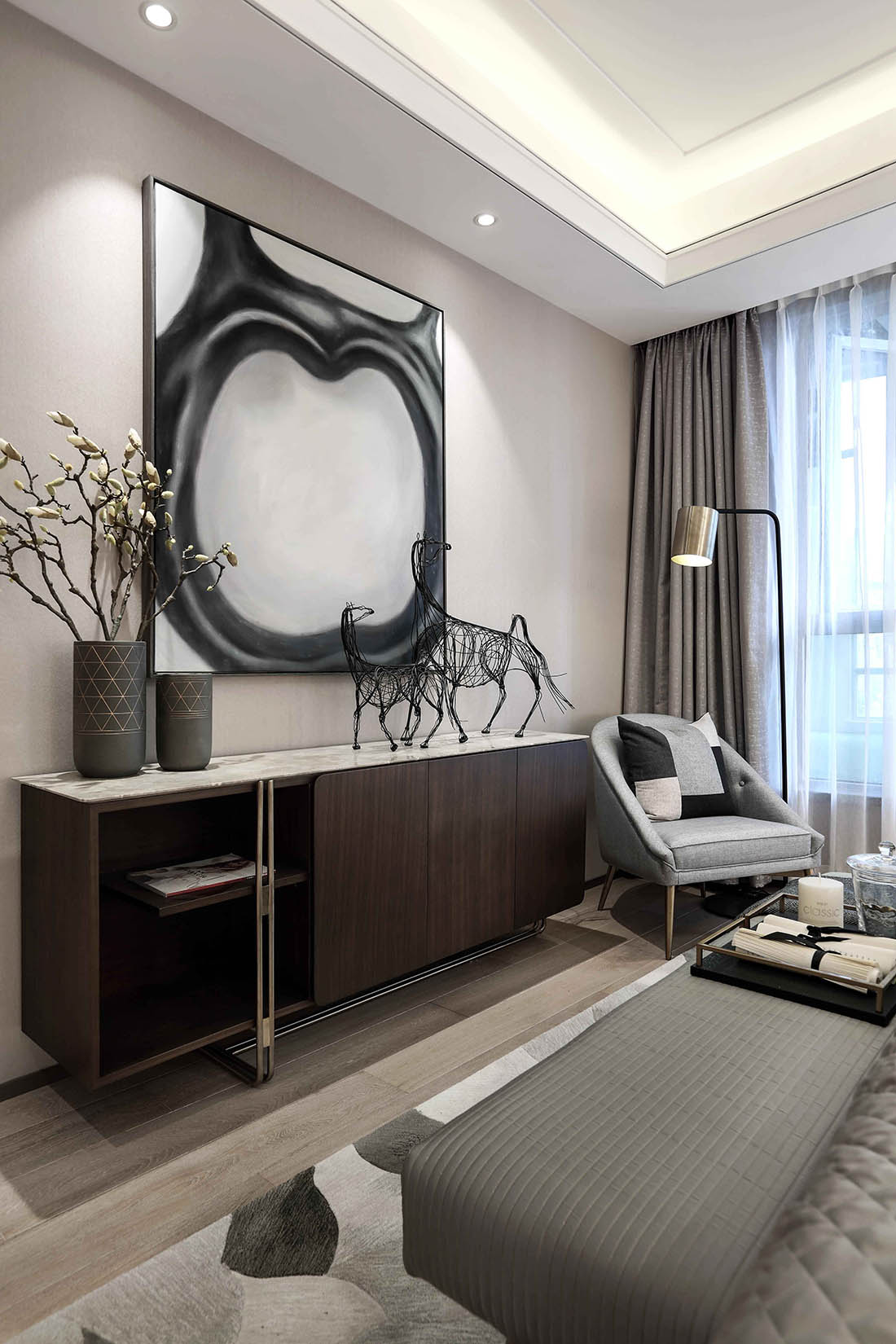 不銹鋼線條,硬包,實木地板,灰色大理石,藝術涂料等