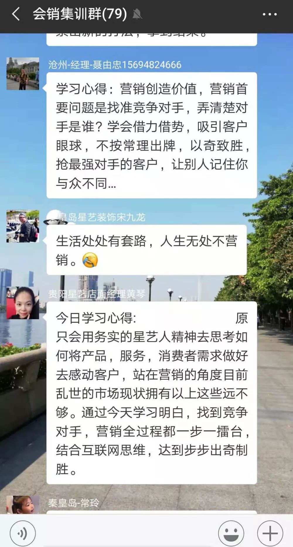 以品宣,以奇勝,打造家裝行業(yè)高效營銷團隊,構(gòu)建企業(yè)低成本創(chuàng)品牌的快速營銷系統(tǒng)。12月3日至5日,廣東星藝裝飾集團“奇勝營銷”會銷集訓(xùn)在廣州舉行。來自星藝29家公司的總經(jīng)理、營銷團隊管理者、營銷策劃負責(zé)人共70多人參加集訓(xùn)。集團董事長兼總裁余敏、常務(wù)副總裁孫師恒、總裁助理黃勇、行政中心總監(jiān)郝峻、營銷中心總監(jiān)陳和君等到場聽課,對構(gòu)架星藝營銷系統(tǒng)和打造高效營銷團隊提出具體要求和作出明確指示。