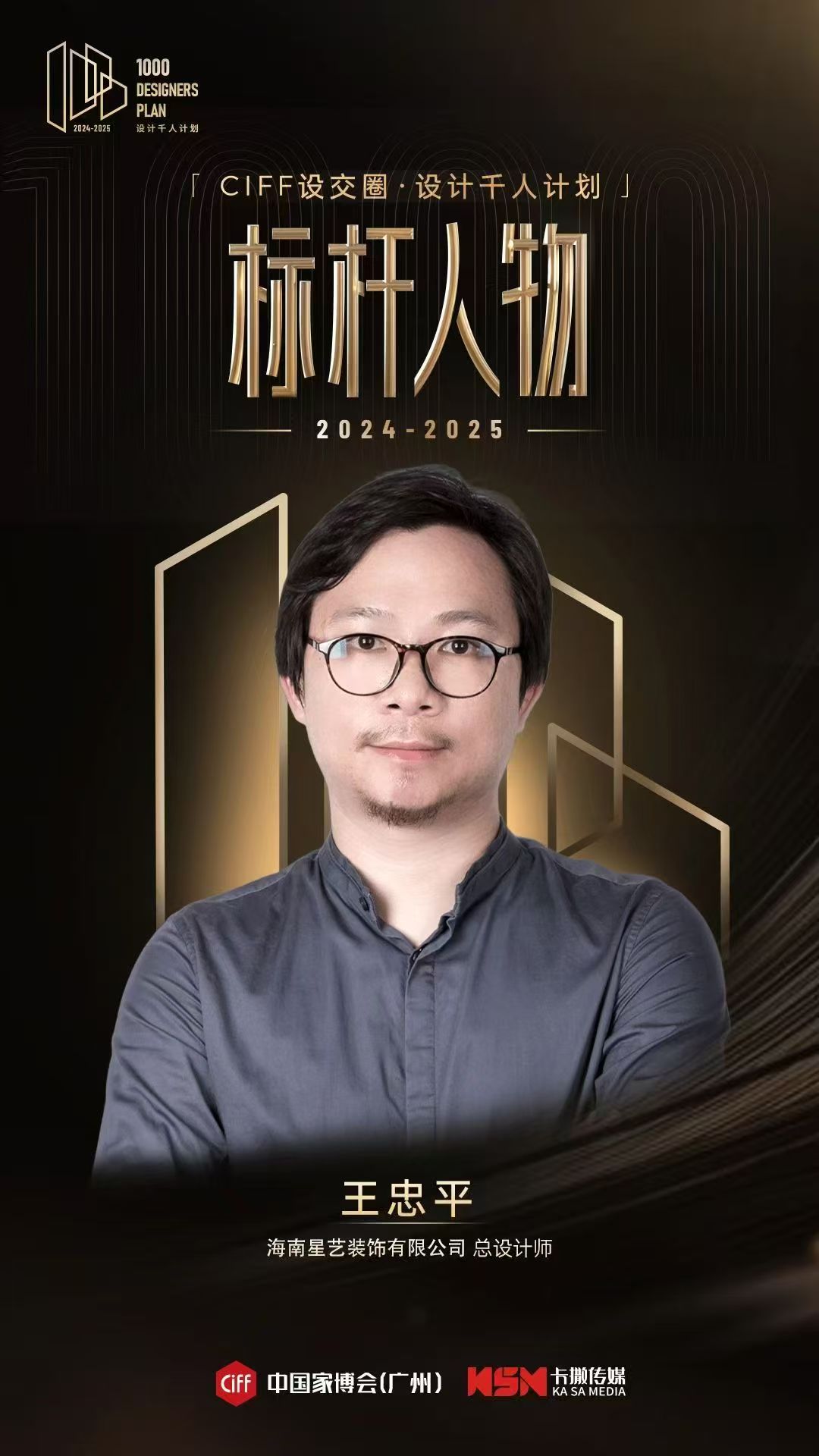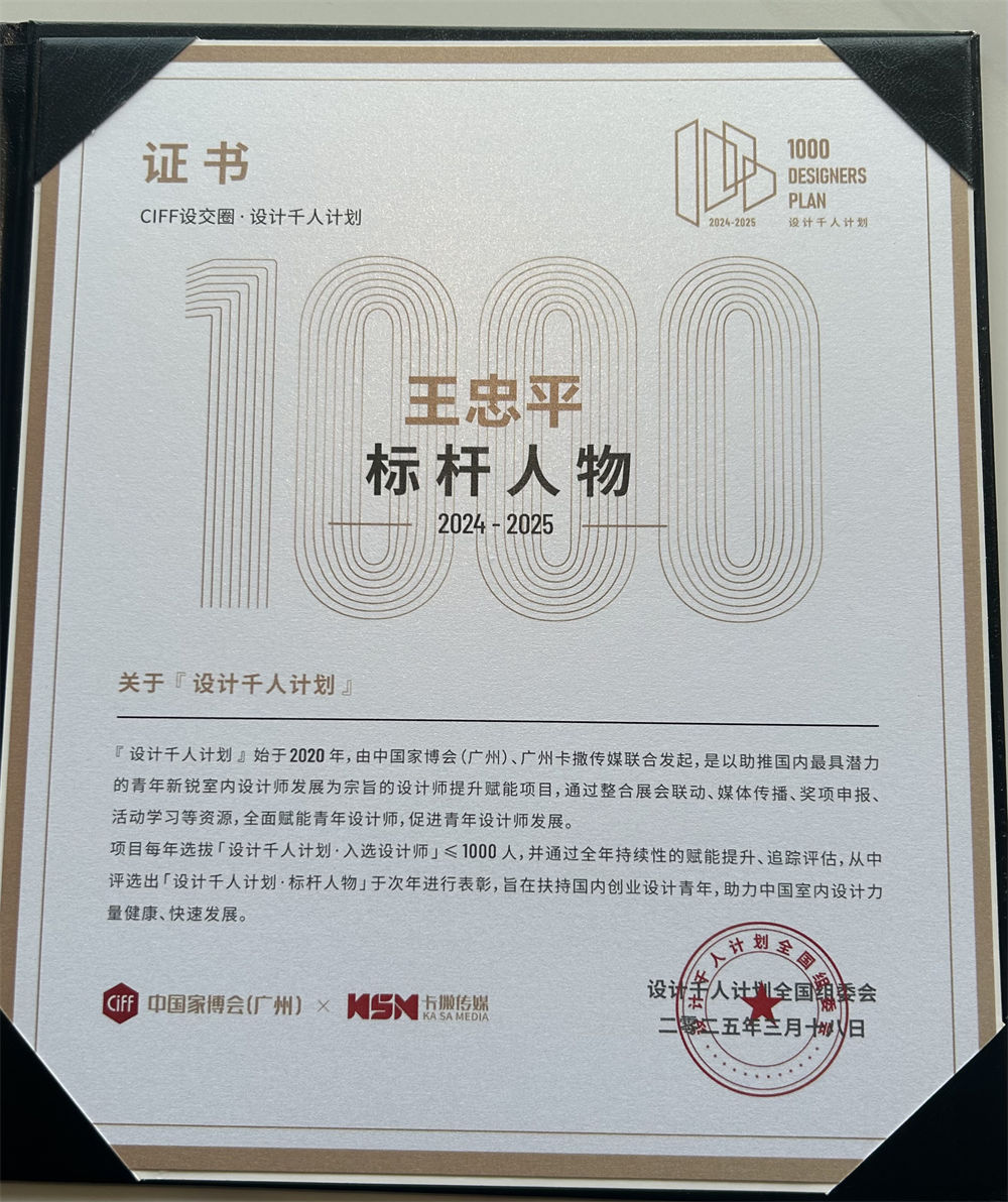 經(jīng)專家嚴(yán)格審核篩選,完成對設(shè)計(jì)師的年度追蹤評估。設(shè)計(jì)師王忠平憑借卓越的行業(yè)表現(xiàn)、優(yōu)秀的落地作品以及對設(shè)計(jì)事業(yè)的深厚熱情,成功脫穎而出,榮獲「設(shè)計(jì)千人計(jì)劃」的最高榮譽(yù)——標(biāo)桿人物。